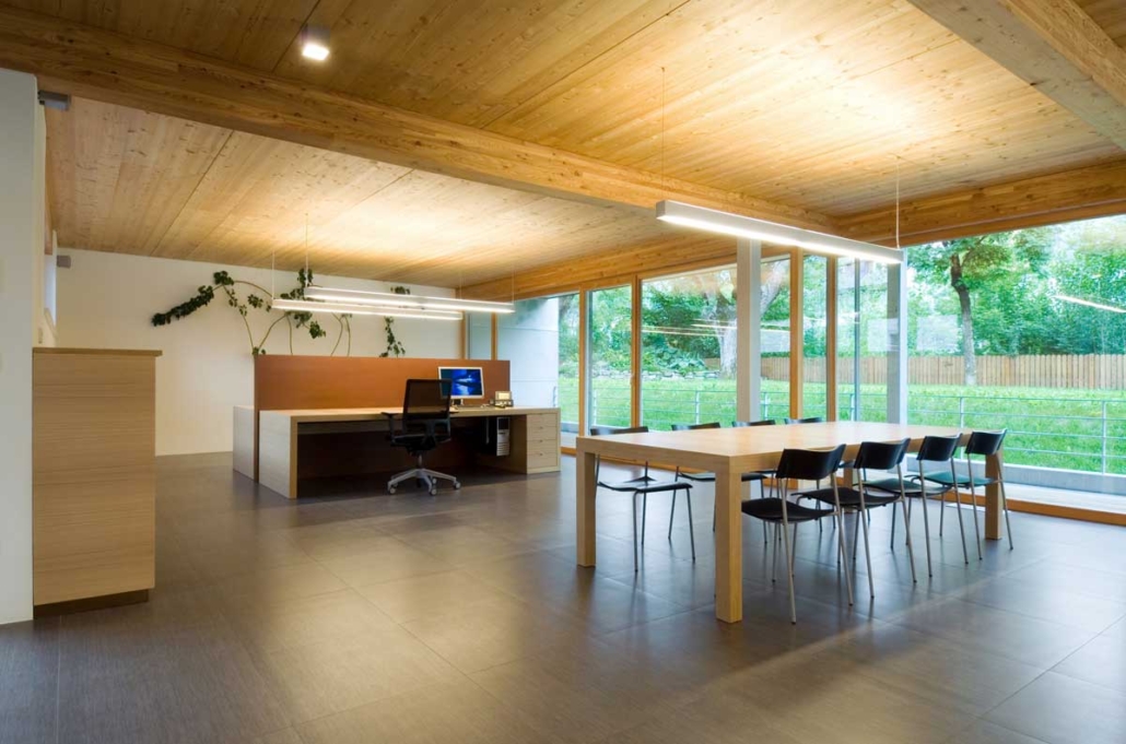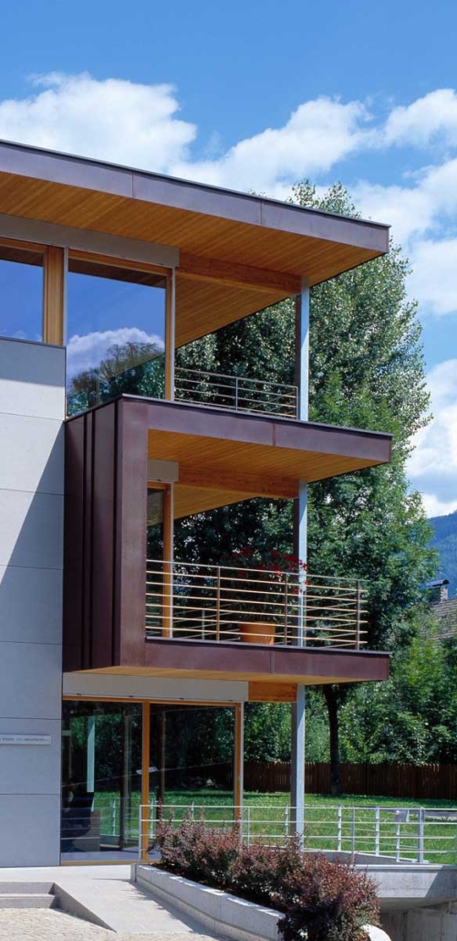 Questo nuovo edificio per uffici va a sostituire il fatiscente edificio preesistente. Attraverso una nuova distribuzione dei volumi, si è ottenuta una conformazione armoniosa del corpo architettonico. La sua forma compatta, l’elevata percentuale di vetrature a sud e ovest e l’alto valore isolante del rivestimento esterno con gli infissi termici e un sistema di ventilazione controllato con recupero di calore fanno sì che il fabbisogno energetico dell’edificio sia ridotto al minimo. Il riscaldamento invernale e il raffrescamento estivo sono assicurati da una pompa geotermica a perforazione profonda.
