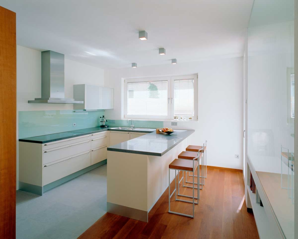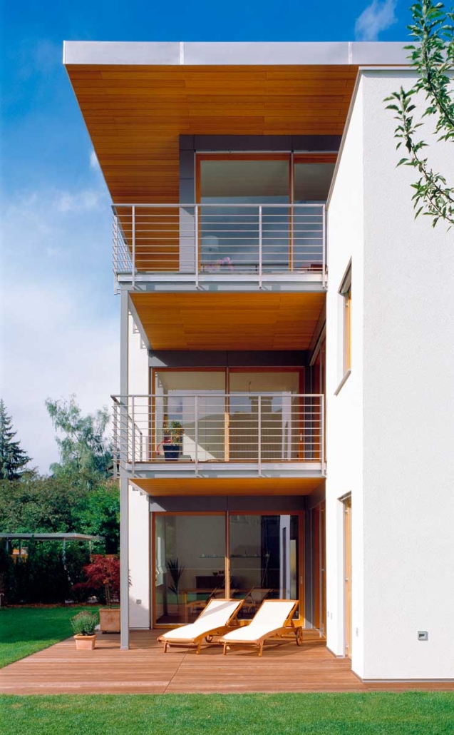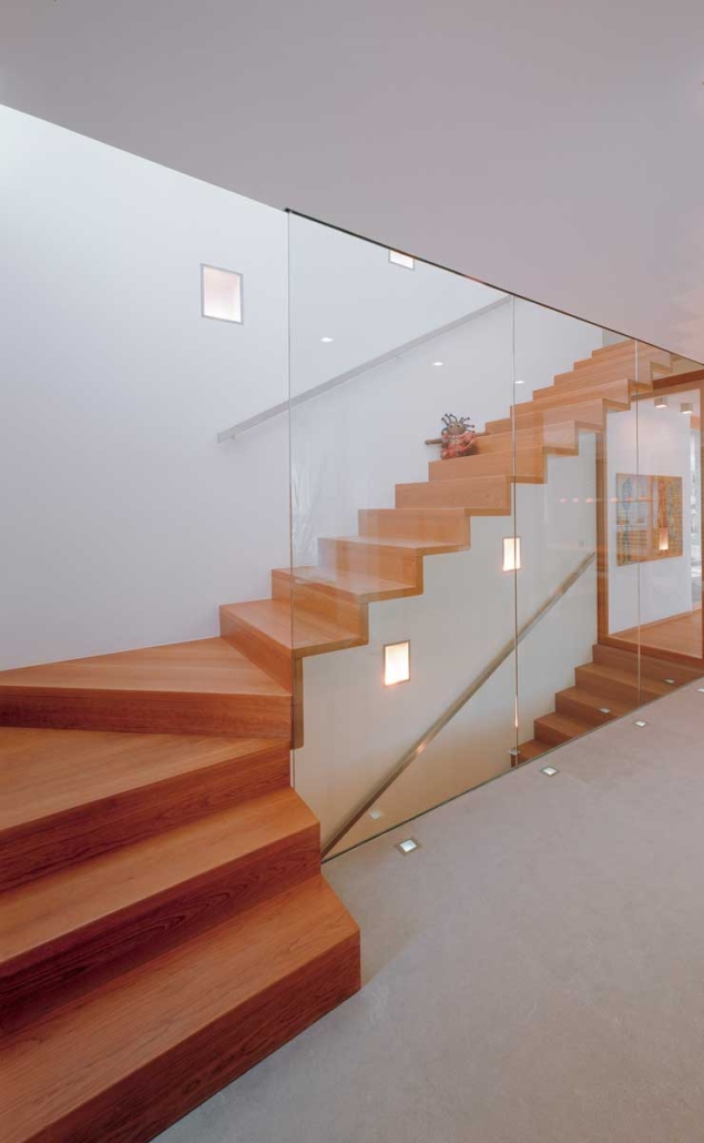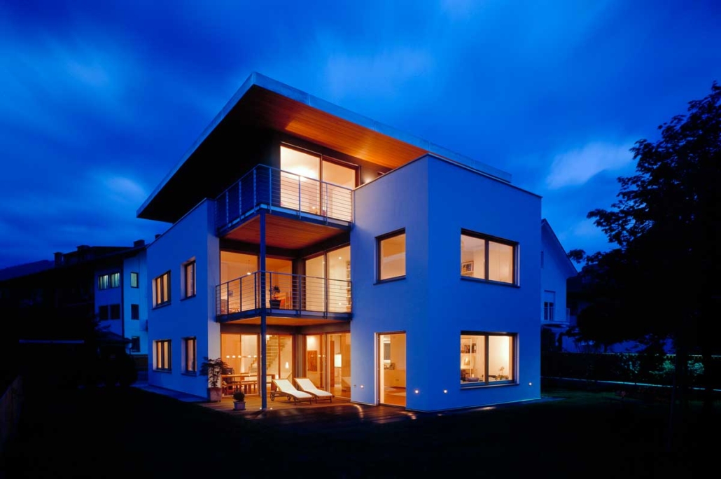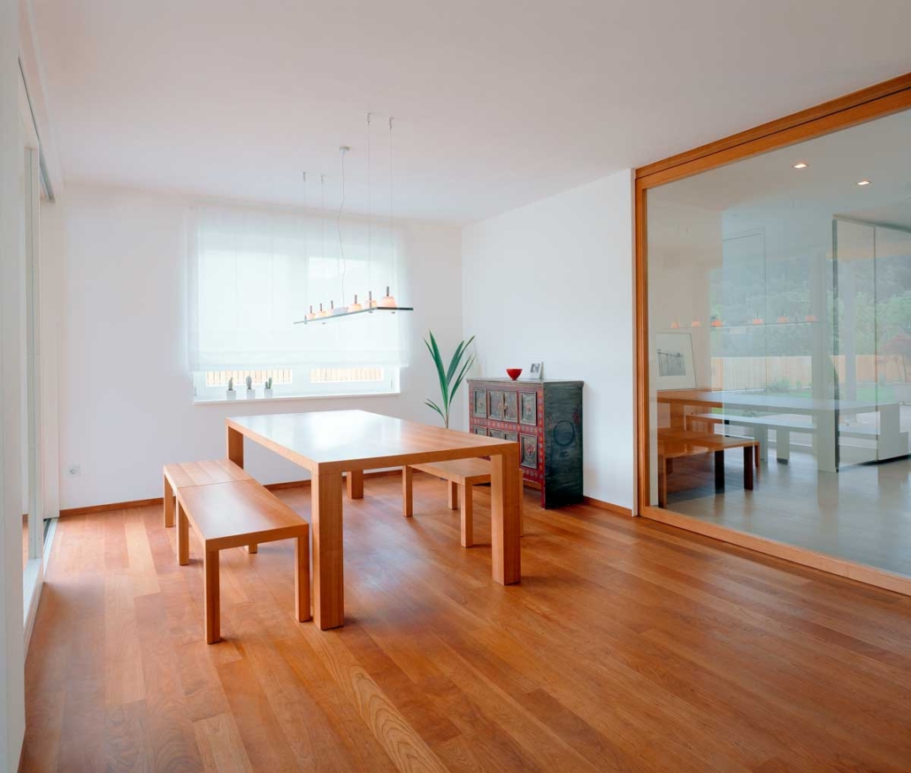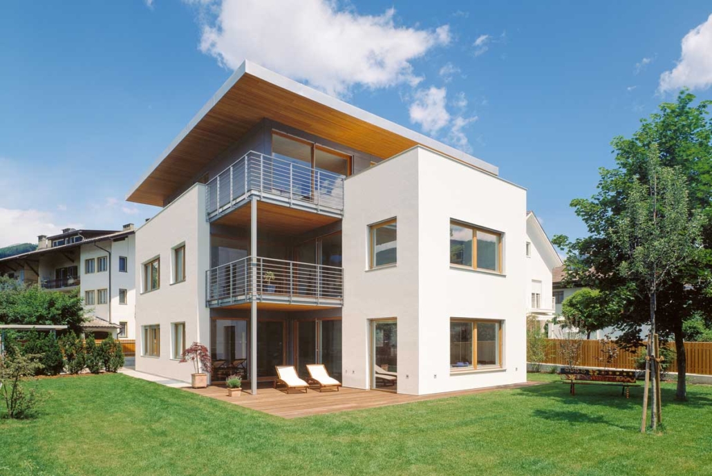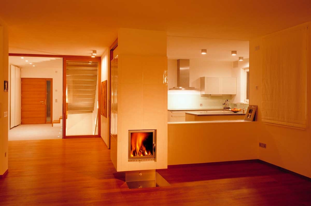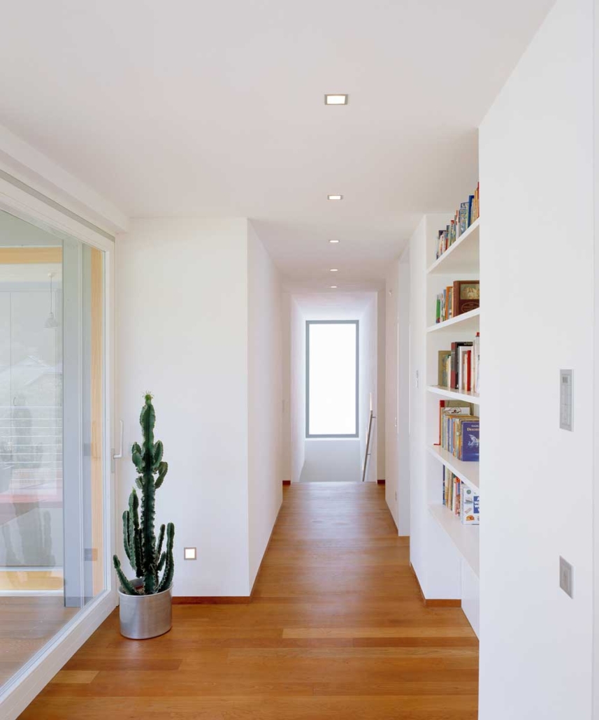 Desiderio dei committenti era che la loro casa si confondesse armoniosamente con le circostanti abitazioni, sia con quelle contemporanee che con le dimore tradizionali, pur mantenendo nella forma e nell’aspetto una discrezione decisa, senza concessioni estetiche. Questo principio ha influito anche sulla scelta dei materiali. Un involucro protettivo in muratura intonacata di bianco e con poche aperture delimita la casa verso la strada e la casa vicina. A sud-ovest invece, il soggiorno si apre e permette al giardino di spaziare oltre la terrazza, consentendo un’ampia vista sulla campagna circostante.