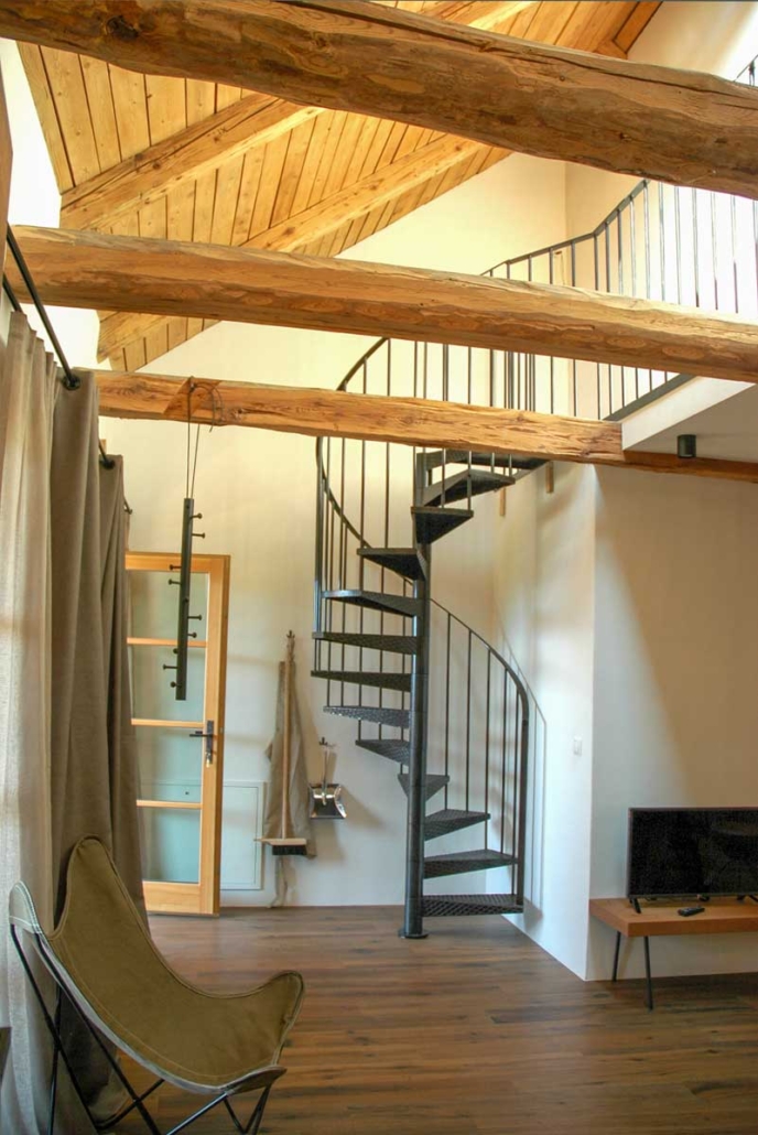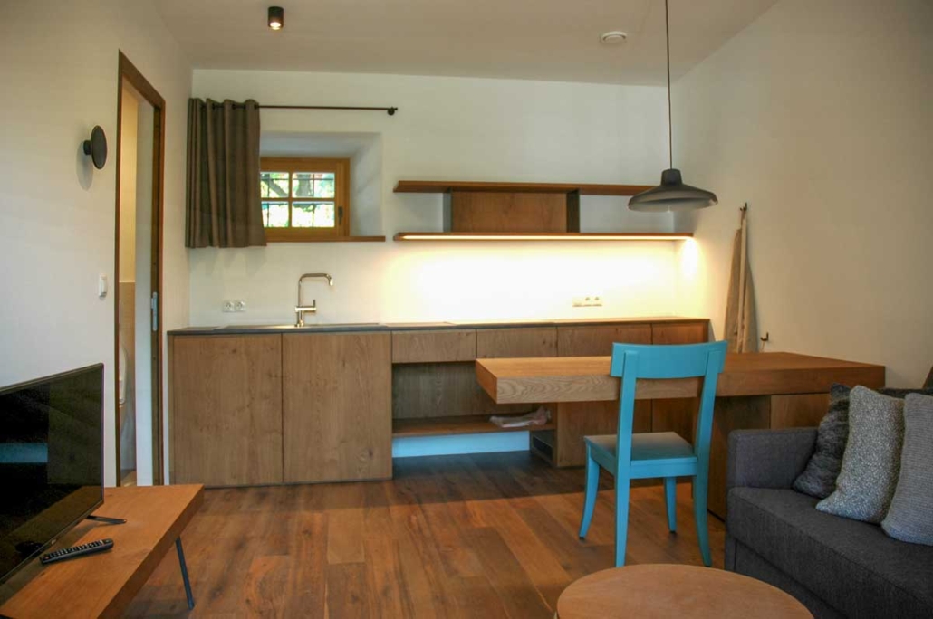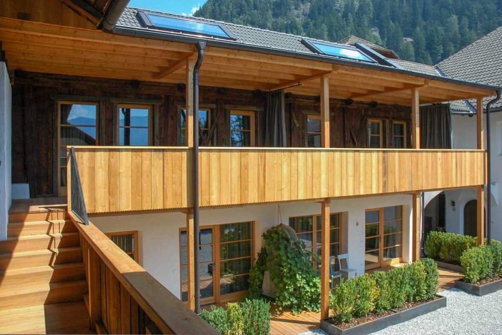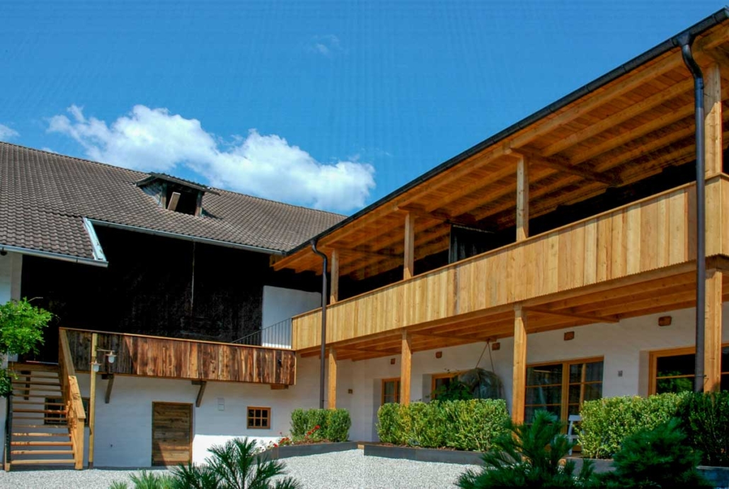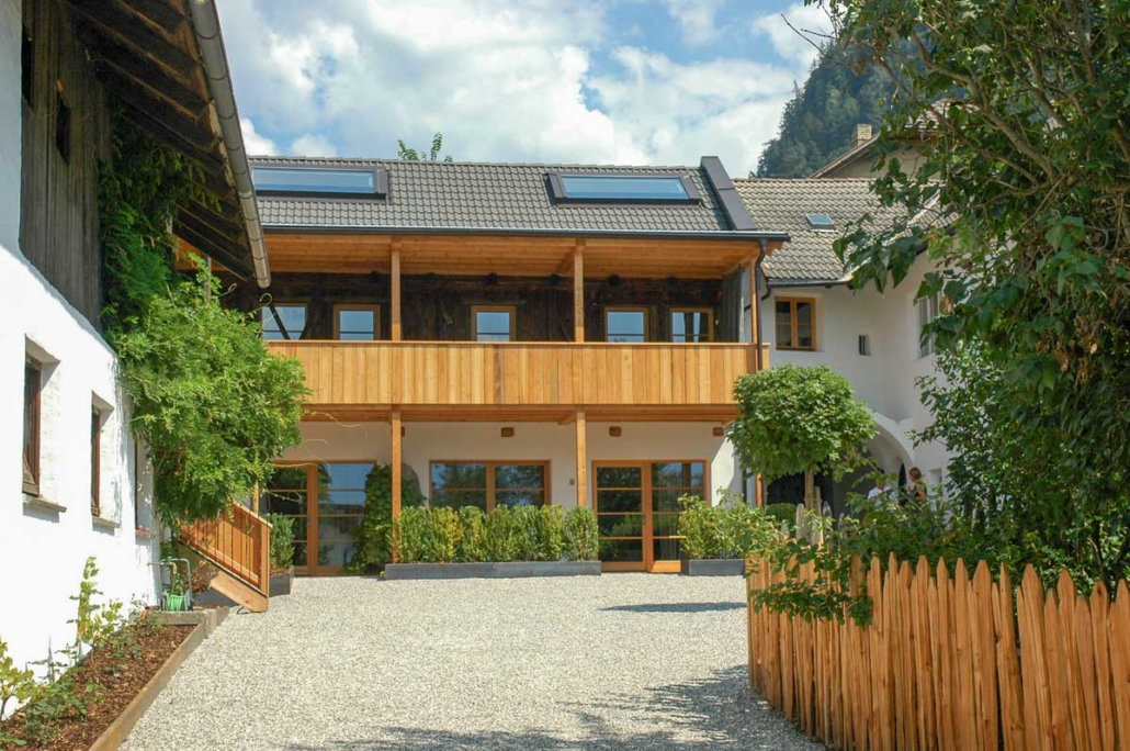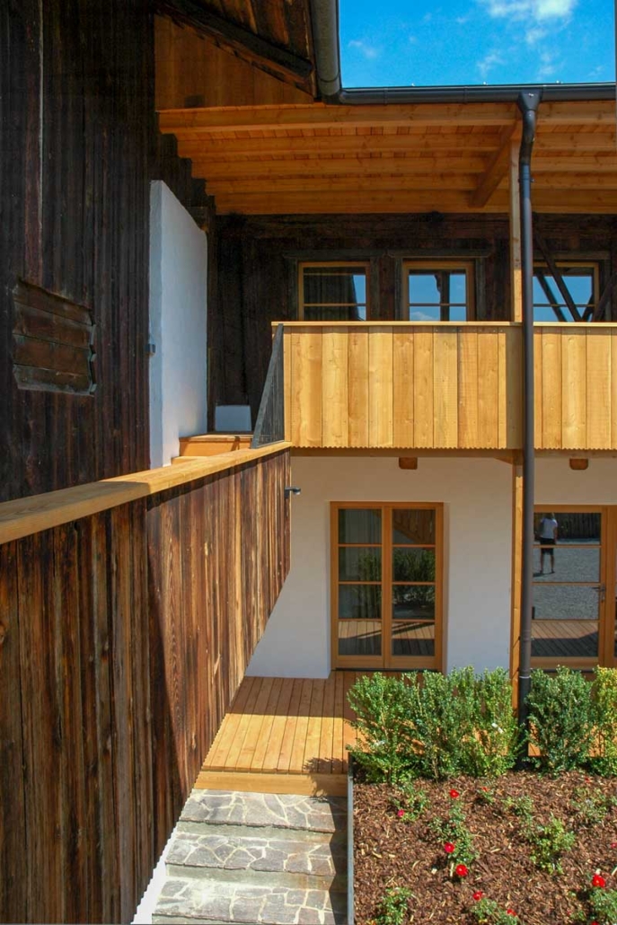 Nel corpo che mette in collegamento edificio residenziale e fattoria sono collocati quattro appartamenti, tutti accessibili dalla corte. La struttura portante esistente viene mantenuta e la nuova costruzione del terrazzo realizzata in legno di larice non trattato.