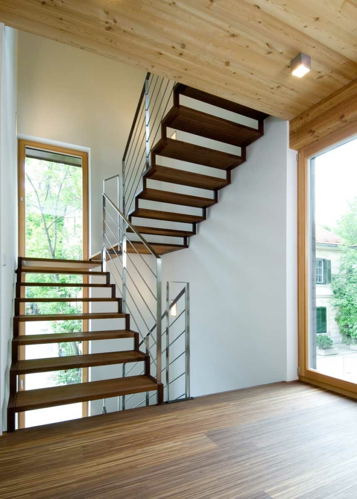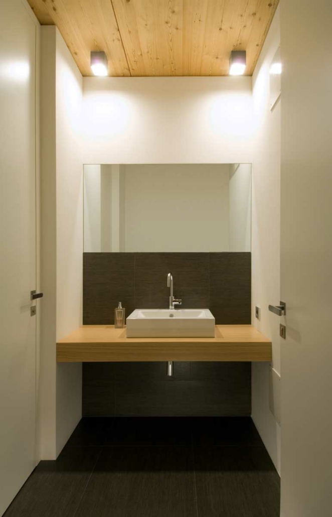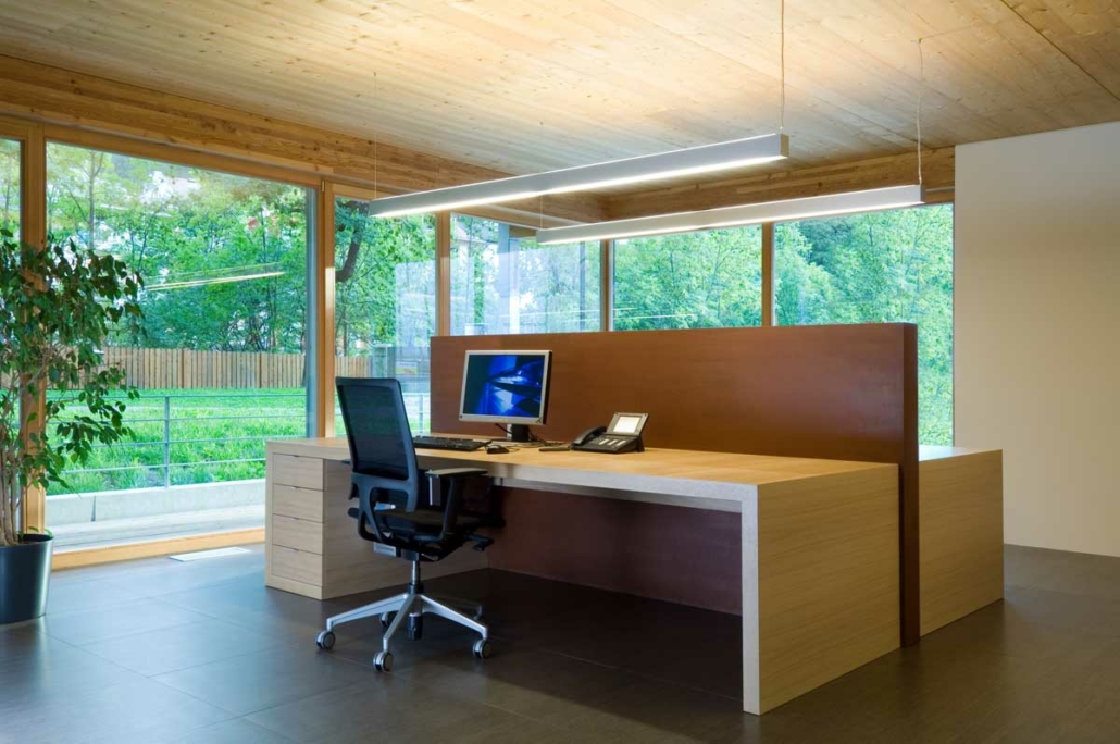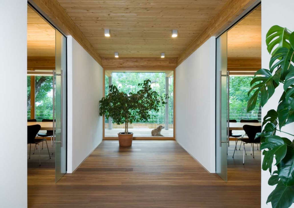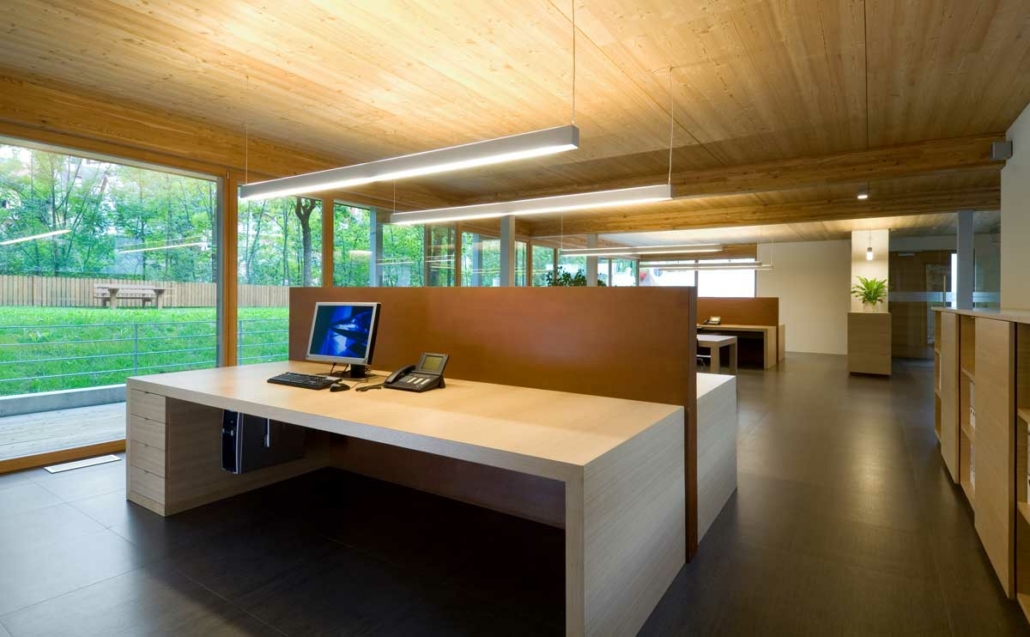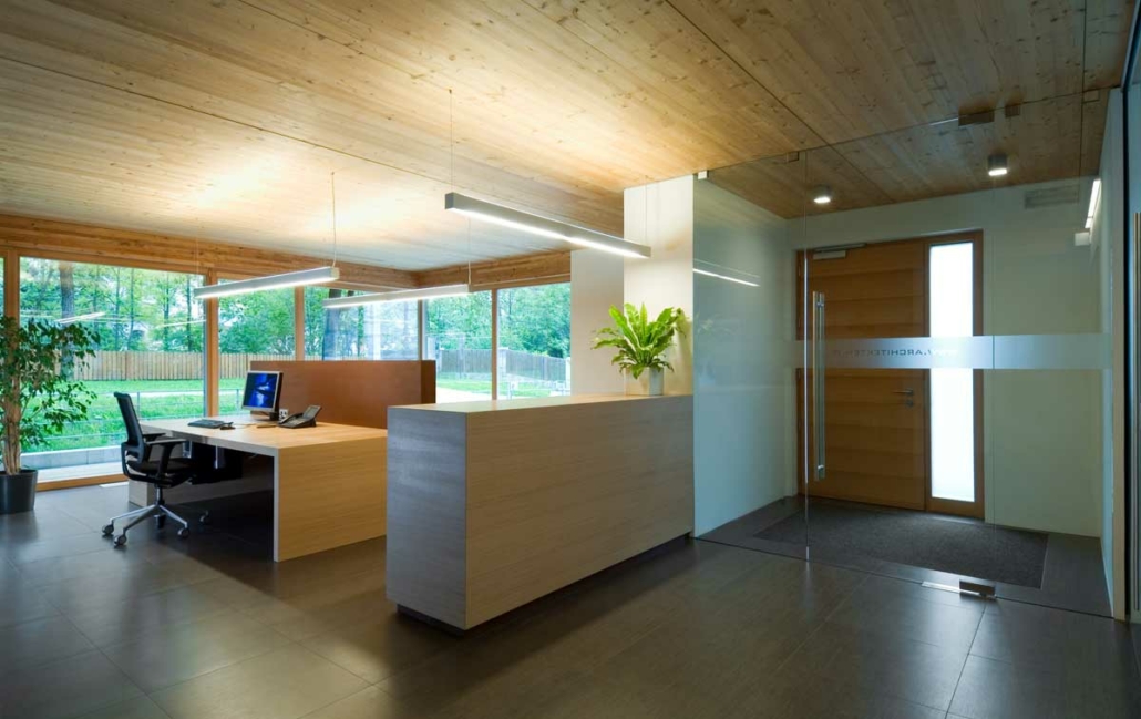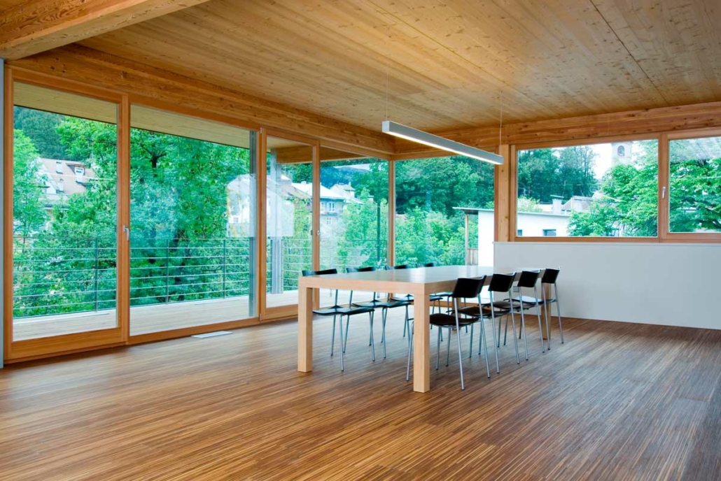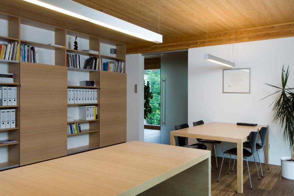 Anstelle eines alten baufälligen Wohnhauses entstand dieses neue Bürogebäude. Durch eine Umverteilung des bestehenden Volumens wurde eine harmonische Gliederung des Gebäudes erreicht. Die kompakte Gebäudeform, der hohe Verglasungsanteil nach Süden und Westen und der hohe Dämmwert der Außenhülle mit den Wärmeschutzfenstern und ein kontrolliertes Lüftungssystem mit Wärmerückgewinnung erfordern einen minimalen Energiebedarf. ausfällt. Heizwärmebedarf und Sommerkühlung werden über eine Erde-Wasser-Wärmepumpe mittels Tiefenbohrung abgedeckt.