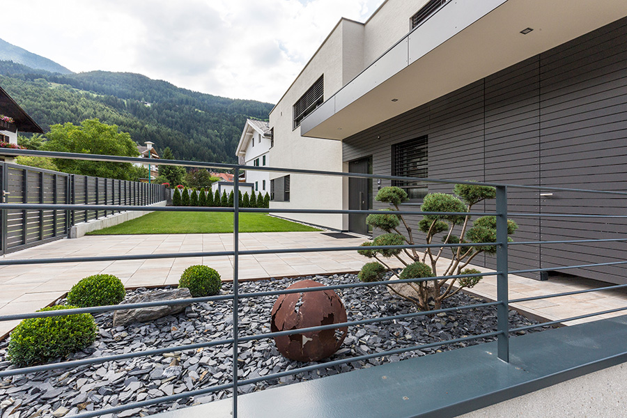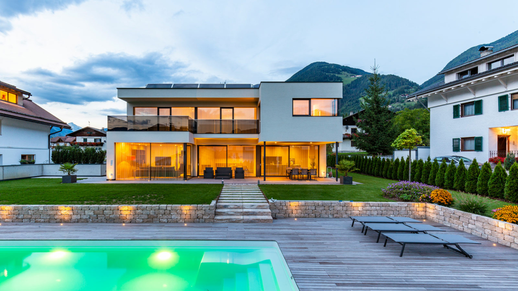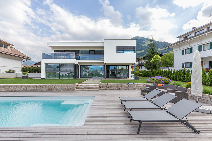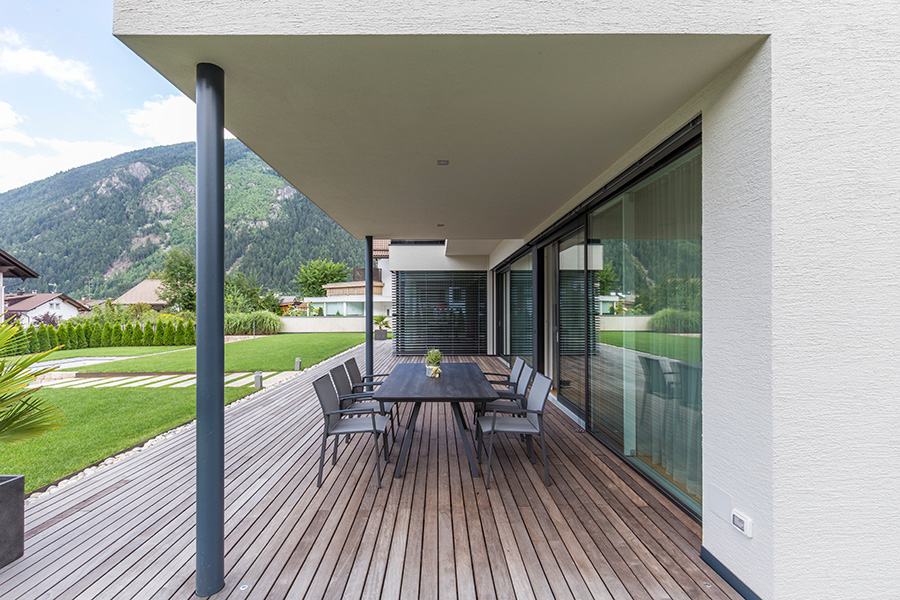Dieses Einfamilienwohnhaus Klimahaus „A“ in Gais wurde als zweigeschossiger Riegel mit kubisch interessanter Volumenverteilung konzipiert. Durch die Auskragung des südostseitigen Obergeschosses entsteht im Erdgeschoss eine großzügige gedeckte Terrasse, die der Küche vorgelagert ist.