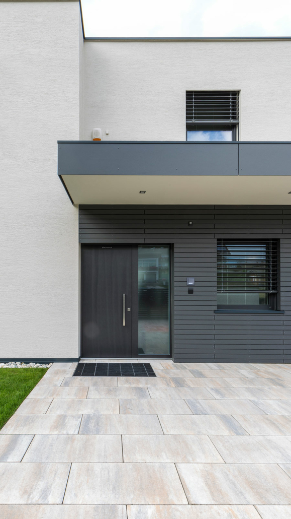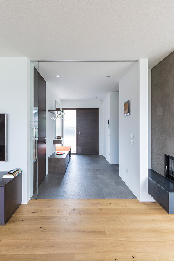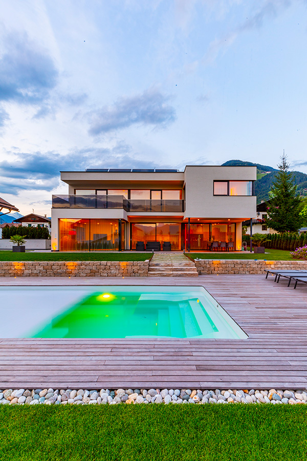 Der vorgestreckte Wohnraum nach Westen schirmt die Terrasse im Erdgeschoss vom Nachbargebäude ab und bietet zusätzlich eine eigene Terrasse für den Kinderbereich im Obergeschoss. Die Südfassade öffnet sich hin zum Garten mit Schwimmbad und lässt durch die großen rahmenlosen Verglasungen den Raum förmlich ins Haus einfließen.